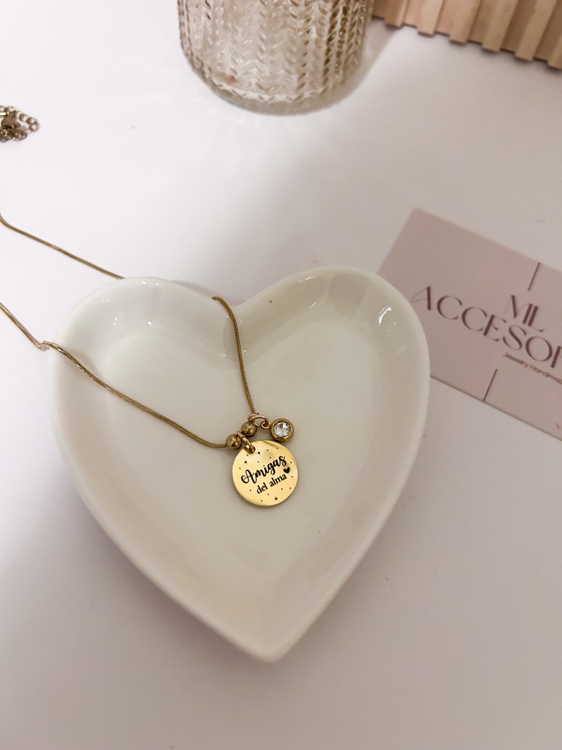 A meaningful gold disc necklace engraved with “Amigas del alma”, created to celebrate deep, genuine friendships. This delicate and elegant piece is a beautiful reminder of that soul connection that feels like family. The minimalist disc design, paired with a subtle crystal accent, makes it perfect for everyday wear.